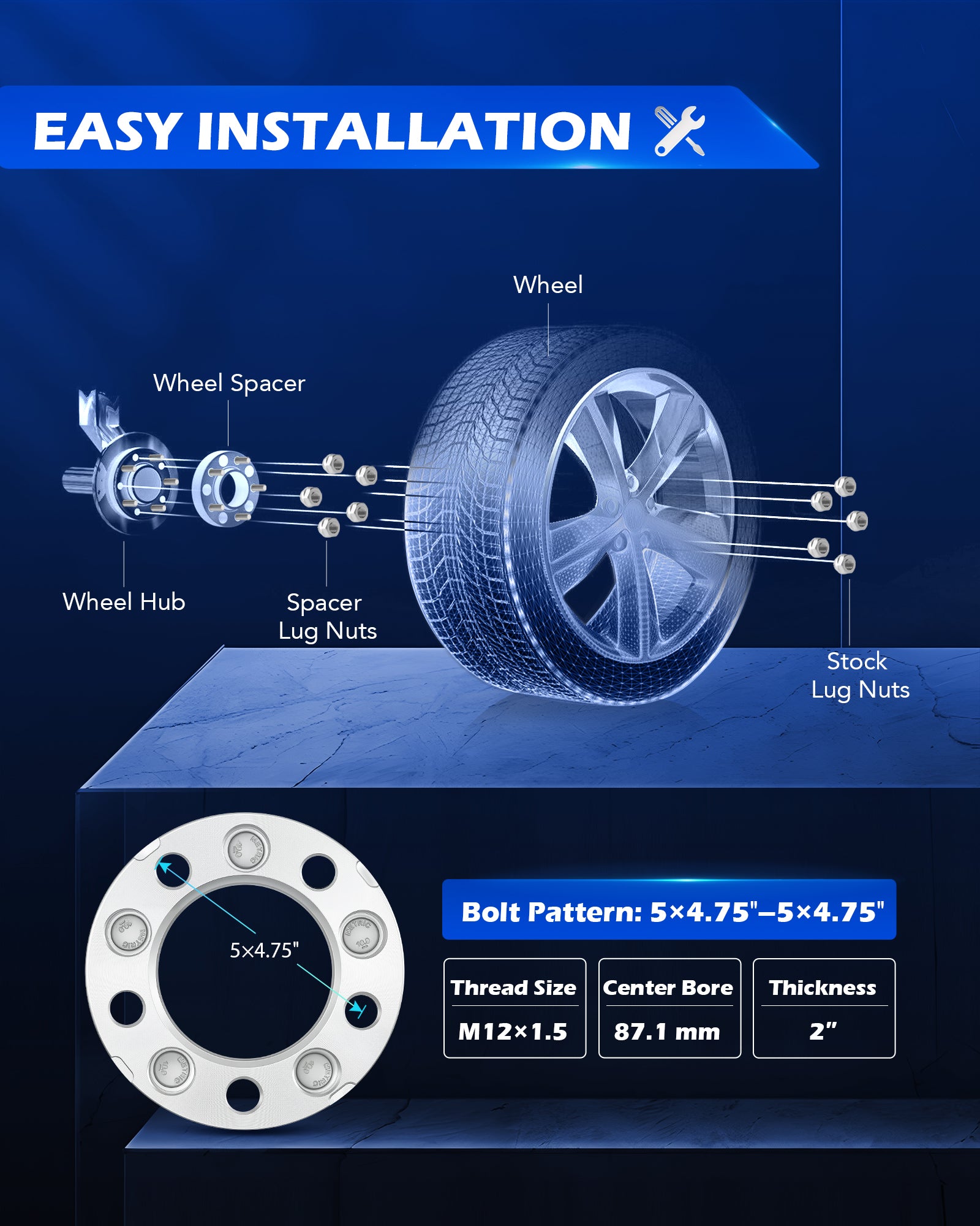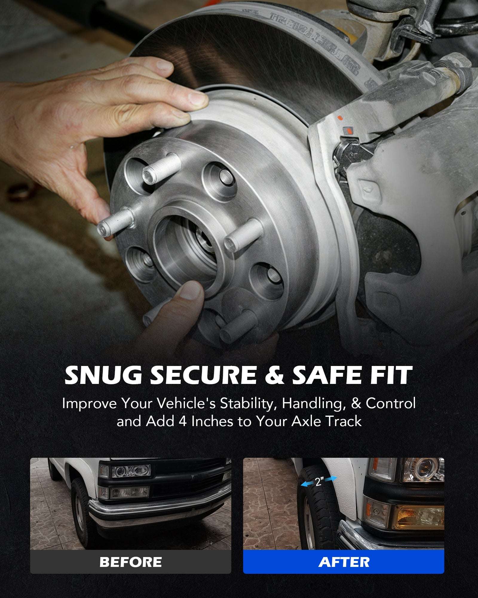 • SAFE AND SECURE: This Orion Motor Tech 5x4.75 in. automotive wheel spacer kit improves the cornering, stability, handling, and control of your vehicle by adding 4 inches to its axle track