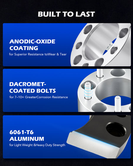 6061-T6 Aluminum: These wheel spacers are made from solid billets of T6 aircraft-grade aluminum to give them low density but high durability and tensile strength.