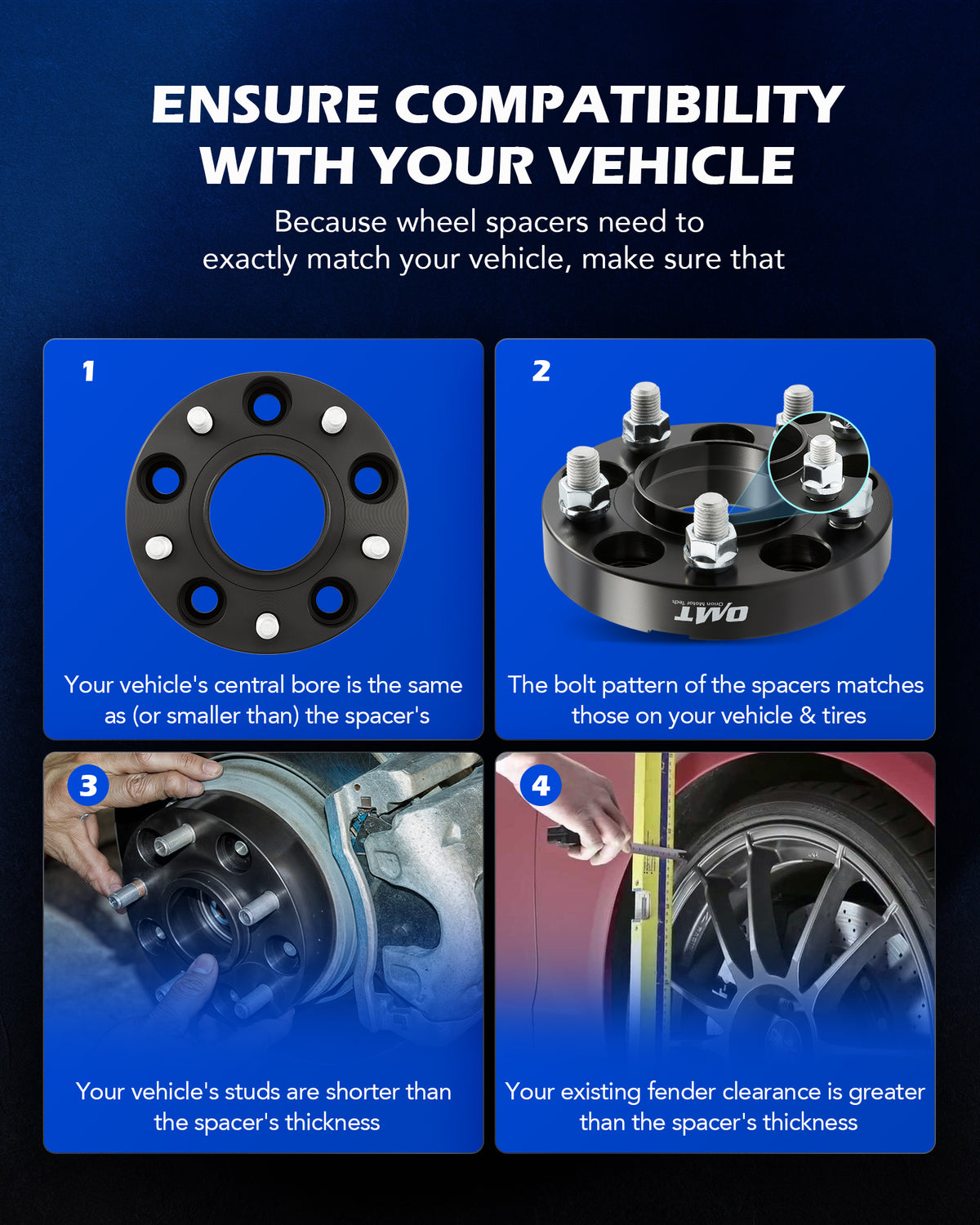 Before purchase, make sure that your wheels' center bore is 2.8 in. (70.5 mm) or smaller; the bolt patterns on your vehicle and tires are 5x4.5 in. (5x114.3 mm); and your vehicle's current studs protrude less than 1 inch (25.4 mm).