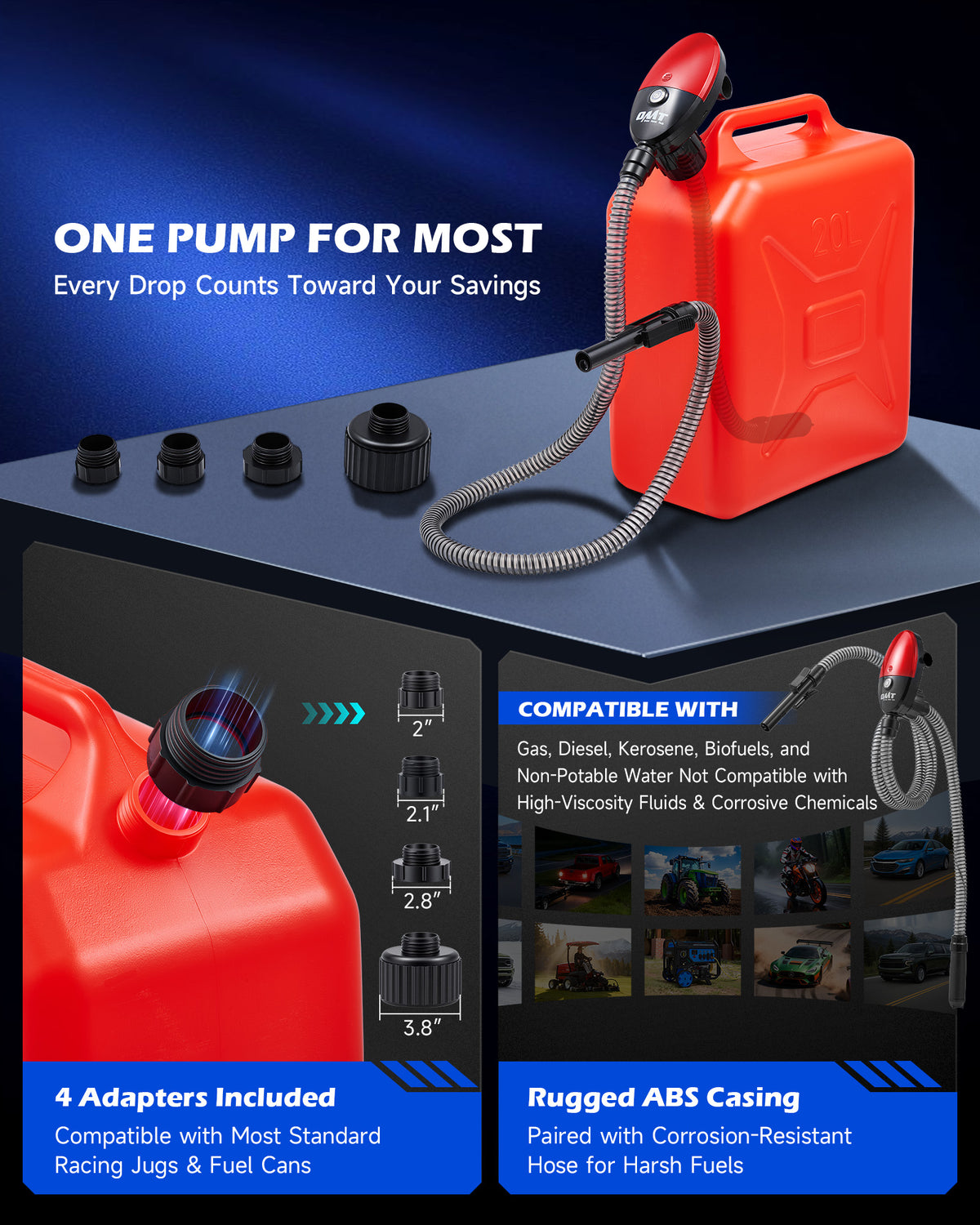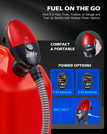 Say goodbye to slow fueling with Orion Motor Tech's fuel transfer pump! With a lightning-fast 3.2 gpm flow rate, it refuels your 5-gallon can in under 2 minutes. The 51-inch extended hose lets you reach the can's bottom, eliminating waste without the need for manual adjustments. Thanks to its auto shutoff, you can walk away while the pump automatically stops when your can is full. Compatible with most North American fuel cans, including VP Racing, this electric fuel pump works with a variety of fuels and comes with 4 adapters to fit them all. Whether you're at the racetrack, dock, or in an emergency, this compact gas can pump, powered by AA batteries or USB-C, is always ready to go.