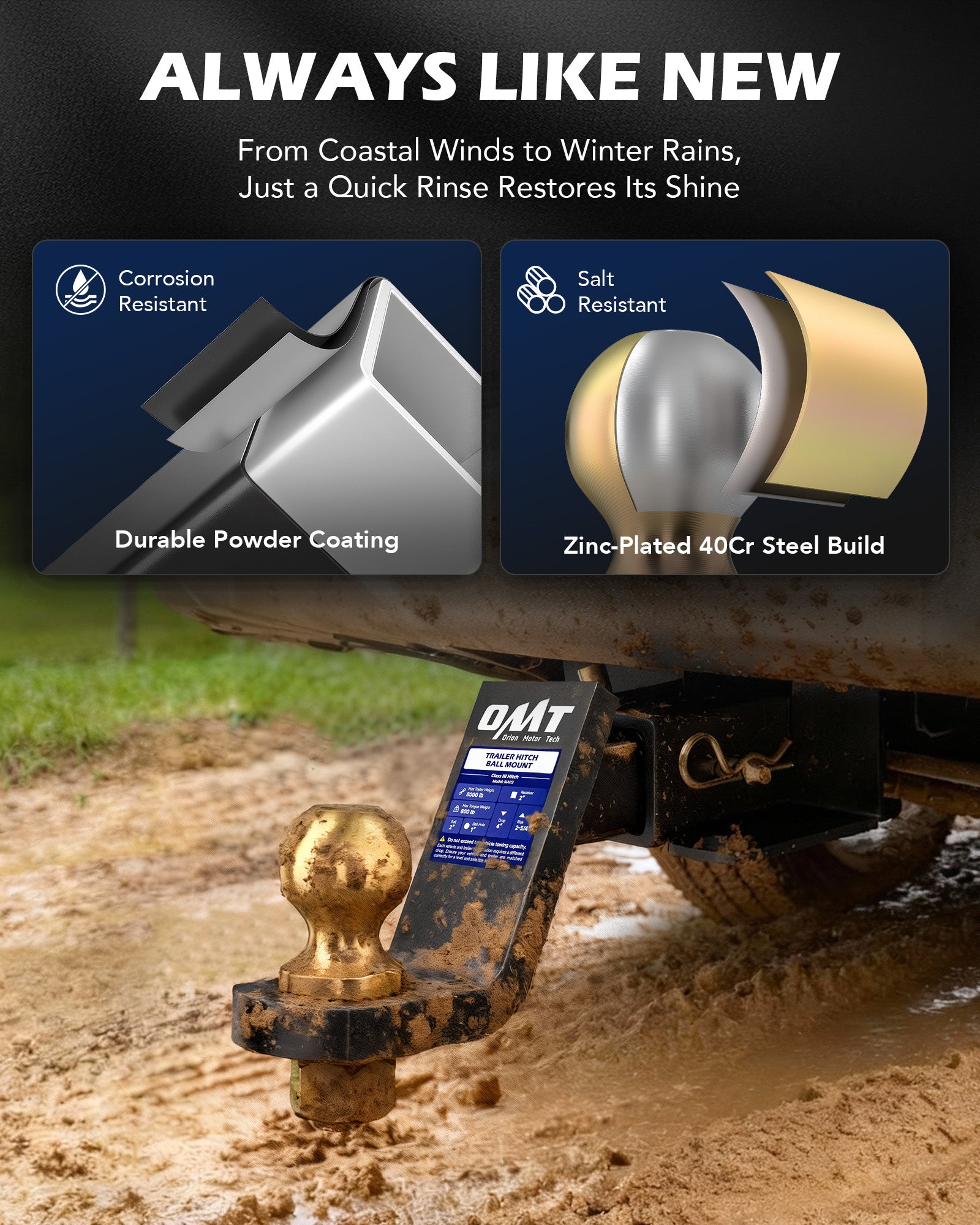 • Built to Resist the Elements: The powder-coated hitch arm and zinc-plated 40Cr steel ball stand up to rain, snow, and salt. Whether you've been towing in snowy winter conditions or near the coast, a quick rinse restores its fresh, like-new shine