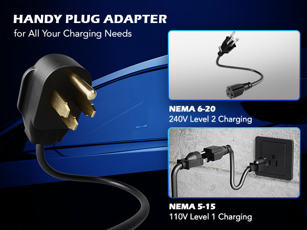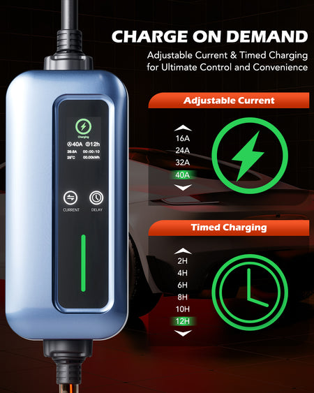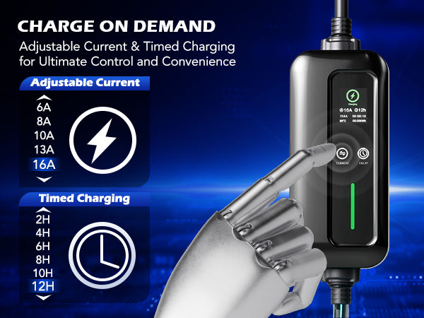 • Set Up in a Flash: Simply plug this portable EV charger into any NEMA 6-20 or 5-15 outlet within 25 feet to start charging and view the status on the LED panel. Charge with adjustable currents of 6/8/10/13/16A and schedule charging time for ultimate convenience.