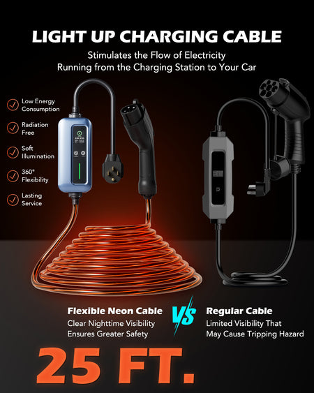 • Visibly Track Your Charging Progress: Track you nighttime EV charging from a distance and say goodbye to cable tripping with Orion Motor Tech's light up EV charger, featuring a neon light charging cable for added visibility and convenience.