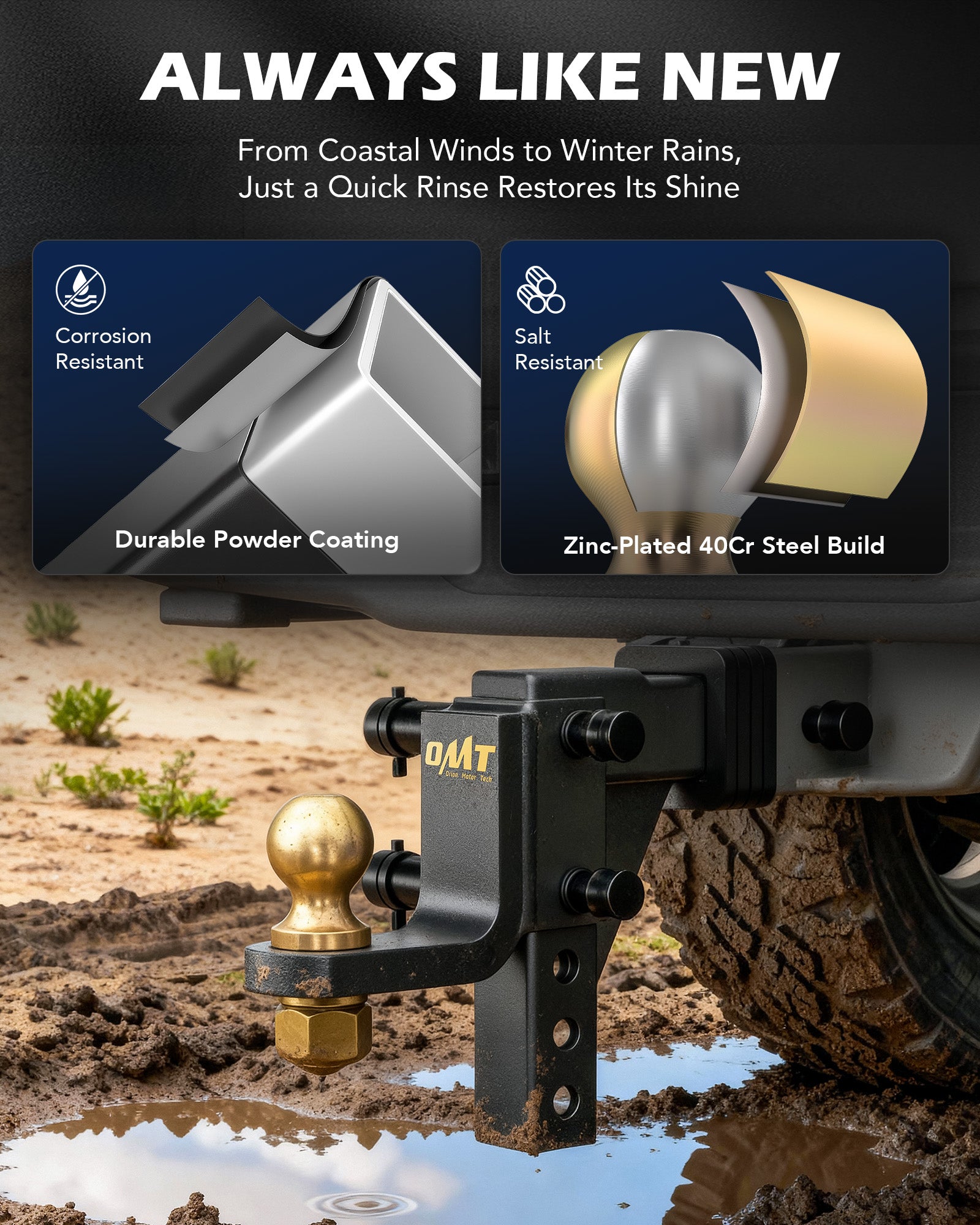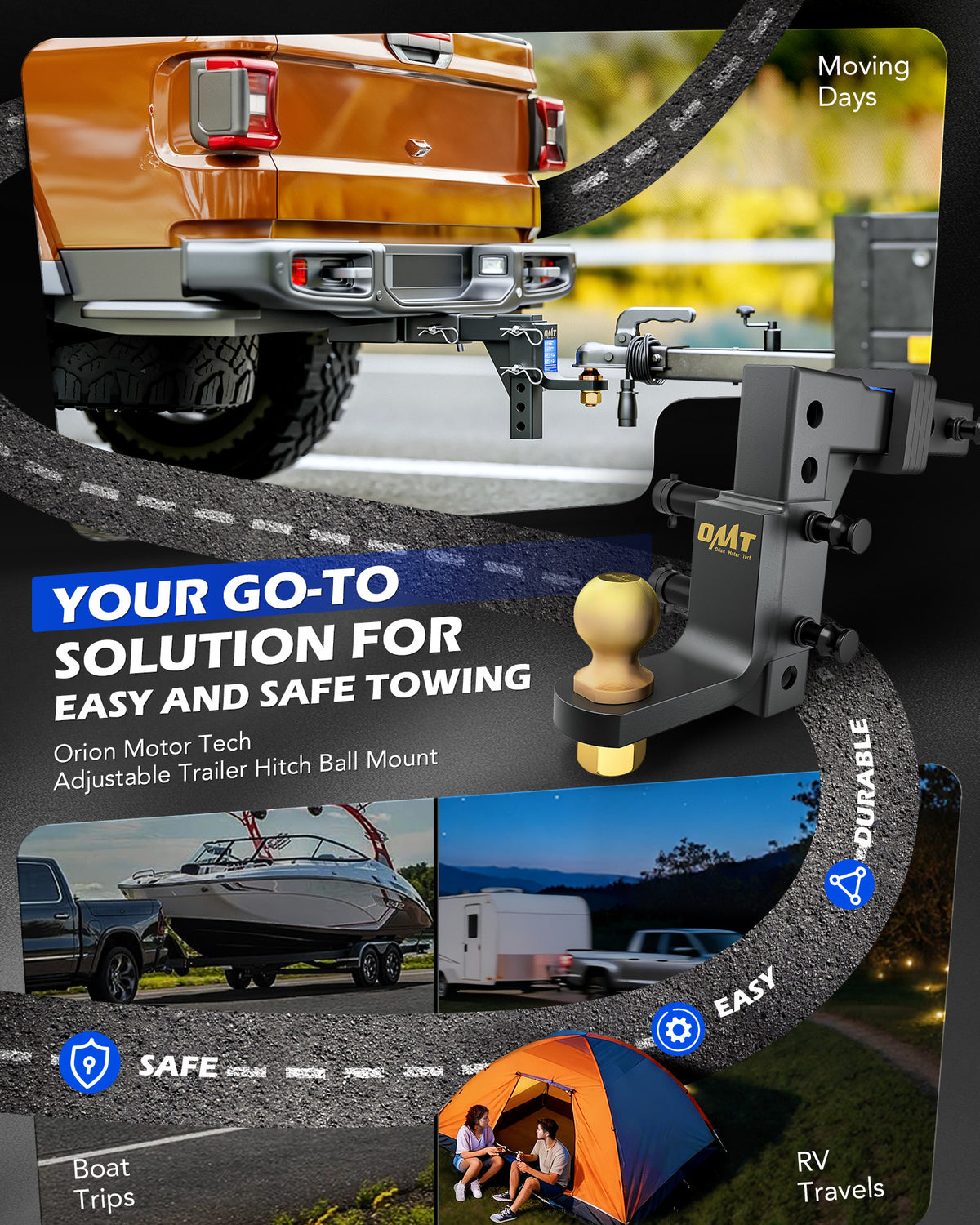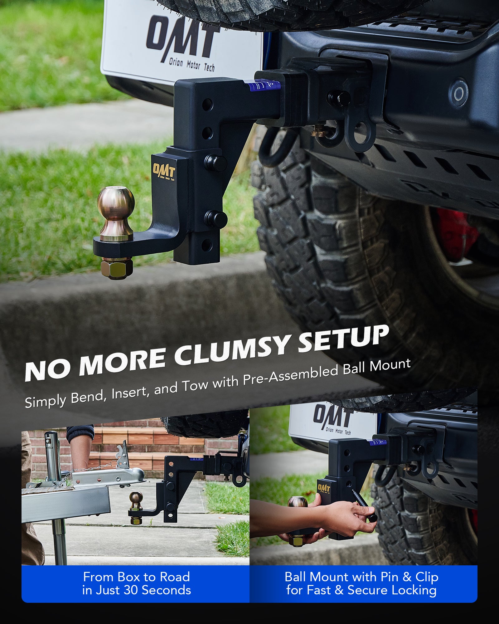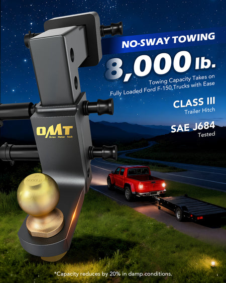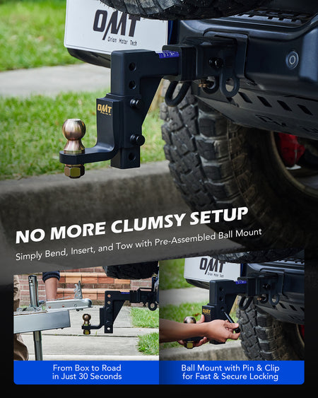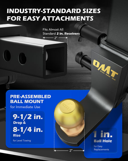 Towing just got easier with Orion Motor Tech's 2 in. trailer hitch ball mount! Designed to fit almost all standard 2 in. receivers, this towing hitch is ready to haul everything from fishing boats to RVs with zero stress. Rated for 7,500 lb. GTW and SAE J684 safety tested, you can confidently tow your fully-loaded F-150 across the country without any sway. Whether you need a 9-1/2 in. drop or a 8-1/4 in. rise, our ball hitch matches your trailer's height. Built tough, our ball mount resists rain, snow, and salt, looking like new with just a rinse. Plus, with our tool-free design, you'll be on the road faster than you can say "Ready to tow!"