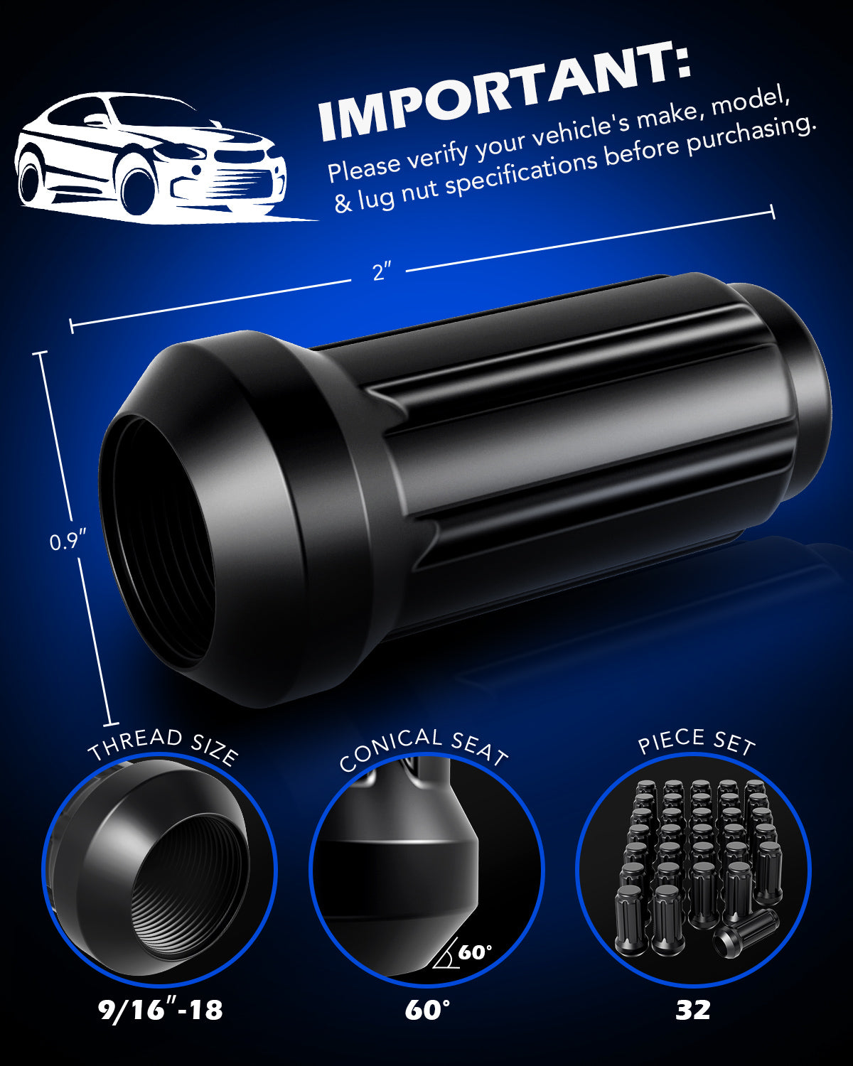 This set of 32 wheel nuts have 60° conical tapered acorn seats, a 9/16-inch thread size, 18 bolt size, and a 21mm or 13/16-inch socket size. They measure 2 in. by 0.91 in. and fit a wide variety of vehicles including 1986-1997 Ford F-350s, 1992-1996 Ford F-250s, and 1999-2015 Ford Super Duty E-350s; 1994-2010 Dodge Ram 2500s and Dodge Ram 3500s; and MORE.